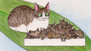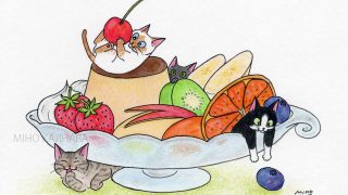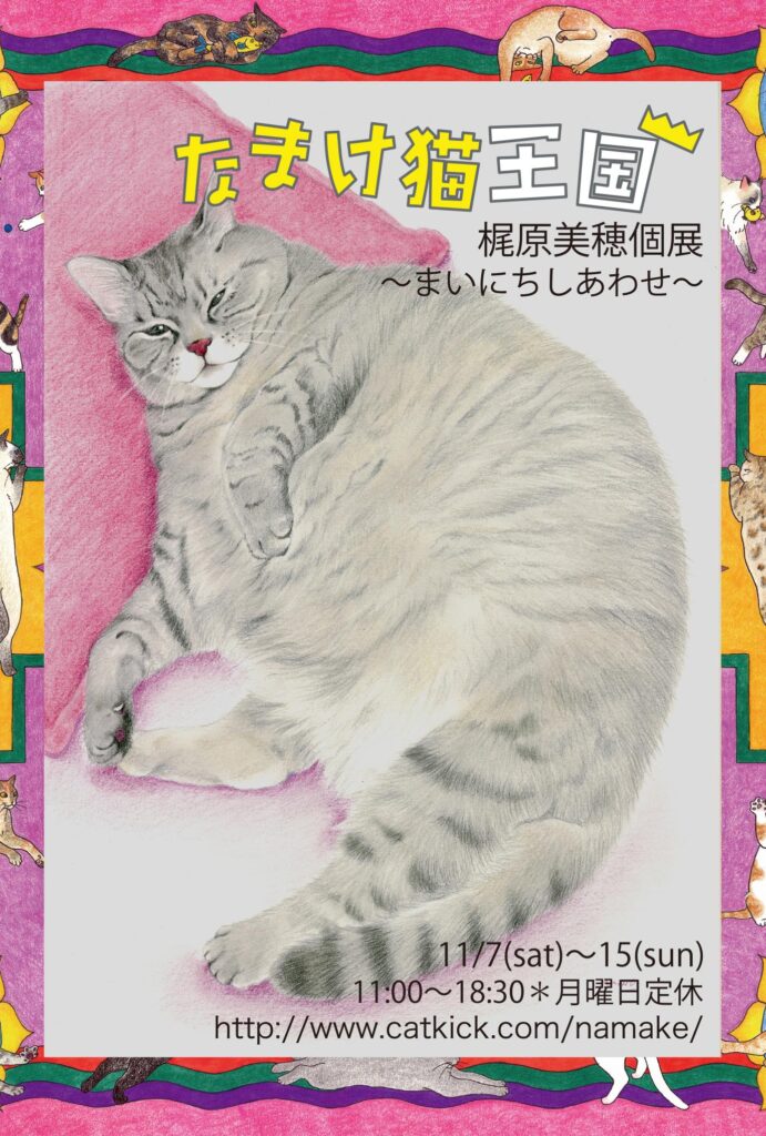 「なまけ猫王国」は、1999年に私が猫作家としての活動を開始した際に、自分のホームページにつけたタイトルです。そして、数年間は色鉛筆で描いたリアルタッチ作品をメインにした個展のタイトルとして使っていました。ちなみに、当時のキャッチコピーは「描いてる人は、なまけてません。」でした。