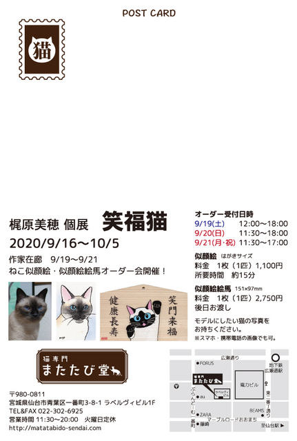 9/16~10/5 宮城県仙台市・またたび堂さまにて個展「笑福猫」