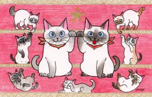 そんな色変わりのシャム猫をイメージしてホットチョコレートに浸かってチョコ色に染まったオトナ猫と真っ白なマシュマロのような子猫たちを描きました。