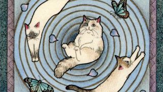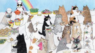 「なまけ猫王国」は、1999年に私が猫作家としての活動を開始した際に、自分のホームページにつけたタイトルです。そして、数年間は色鉛筆で描いたリアルタッチ作品をメインにした個展のタイトルとして使っていました。ちなみに、当時のキャッチコピーは「描いてる人は、なまけてません。」でした。