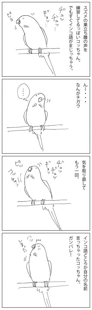 インコのコッちゃんはおしゃべり大好き(あんまり上手じゃないけど)。